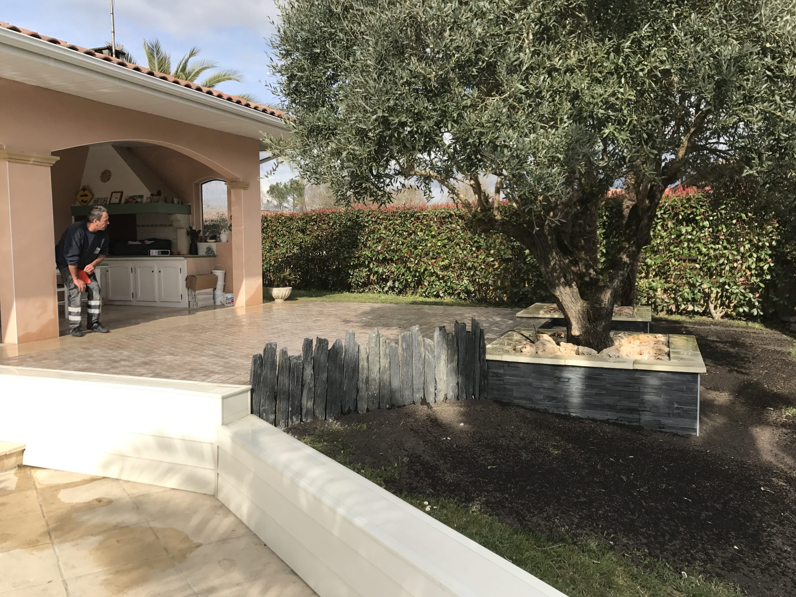 Pour répondre à la demande d’un de nos clients sur la commune d’Orthevielle, nous sommes intervenus pour la création d’une terrasse entièrement sur-mesure et en pavé granit. Cette création réalisée par les experts d’Inter Exter comprend aussi deux magnifiques jardinières avec habillage en parement de pierre.